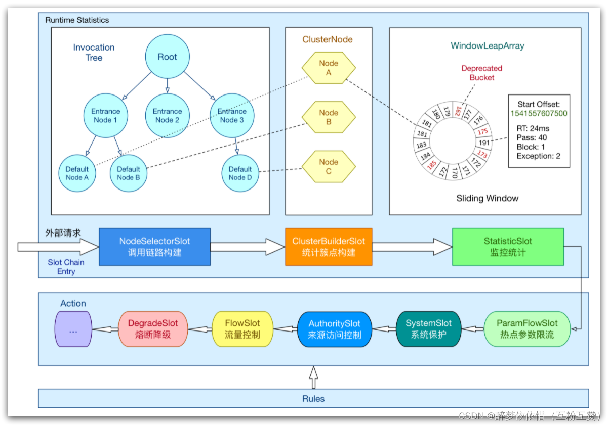 entranceNode)、本次调用链路的 curNode(当前资源节点)、调用来源(origin)等信息。后续的Slot都可以通过Context拿到DefaultNode或者ClusterNode,从而获取统计数据,完成规则判断