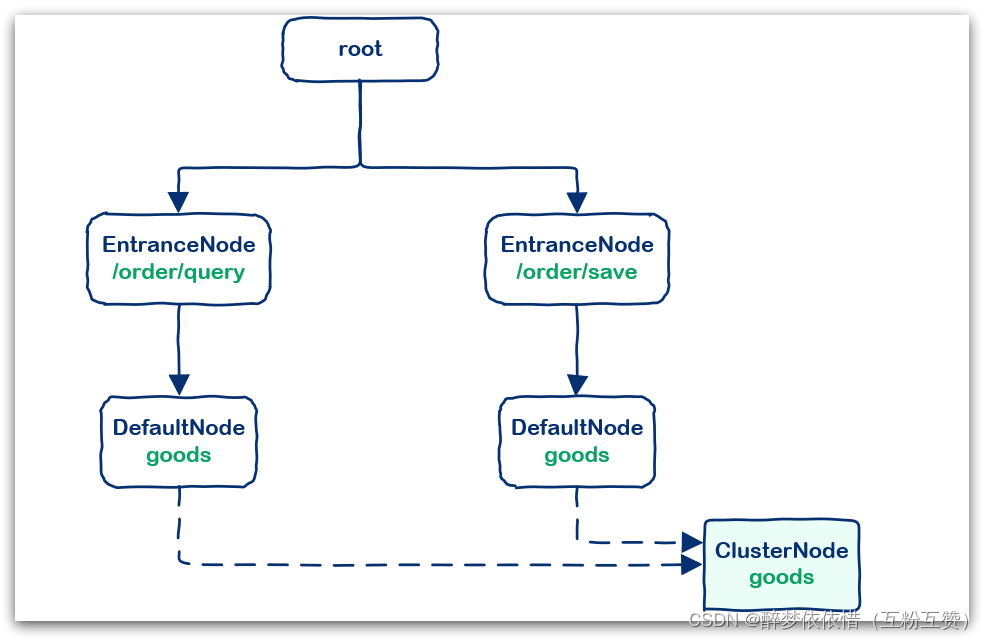 DefaultNode:代表链路树中的每一个资源,一个资源出现在不同链路中时,会创建不同的DefaultNode节点。而树的入口节点叫EntranceNode,是一种特殊的DefaultNode