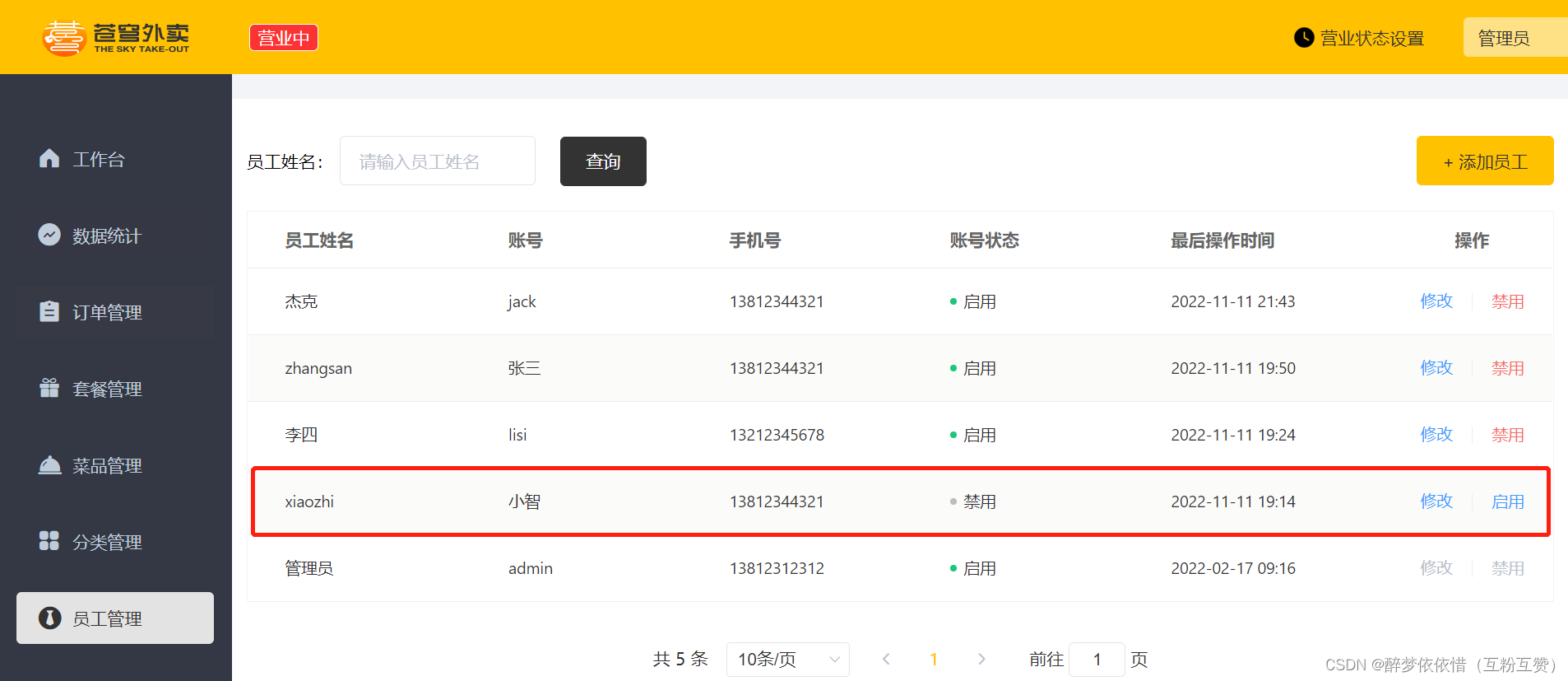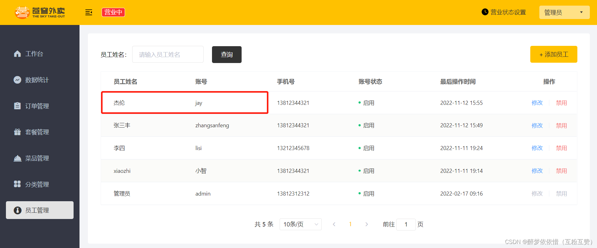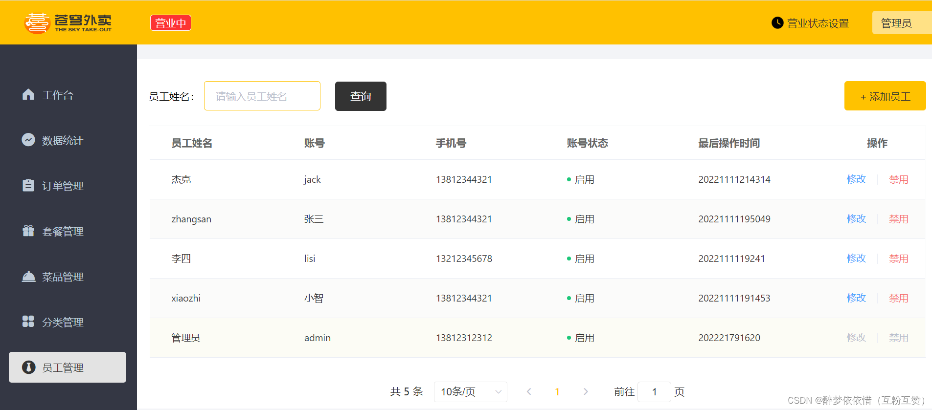 后台系统中可以管理员工信息,通过新增员工来添加后台系统用户。