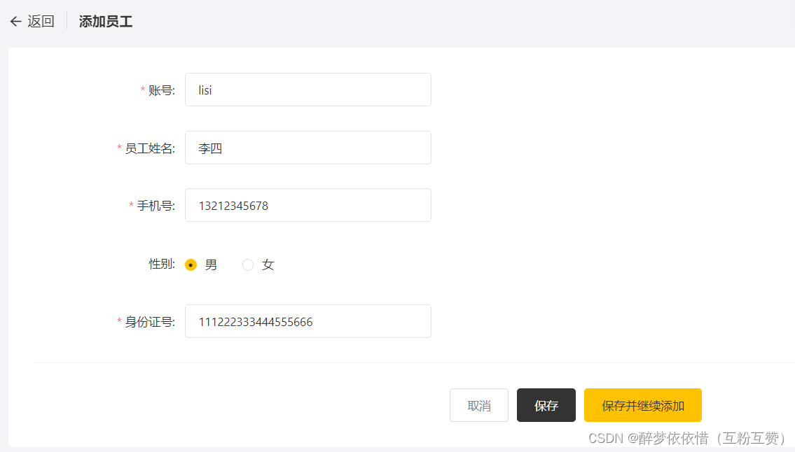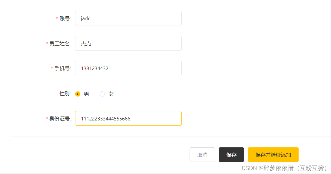 新增员工,其实就是将我们新增页面录入的员工数据插入到employee表。