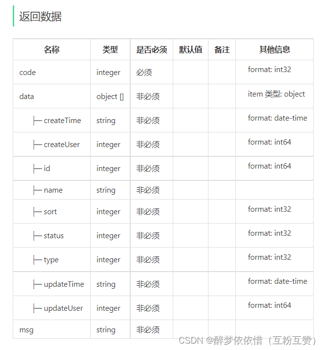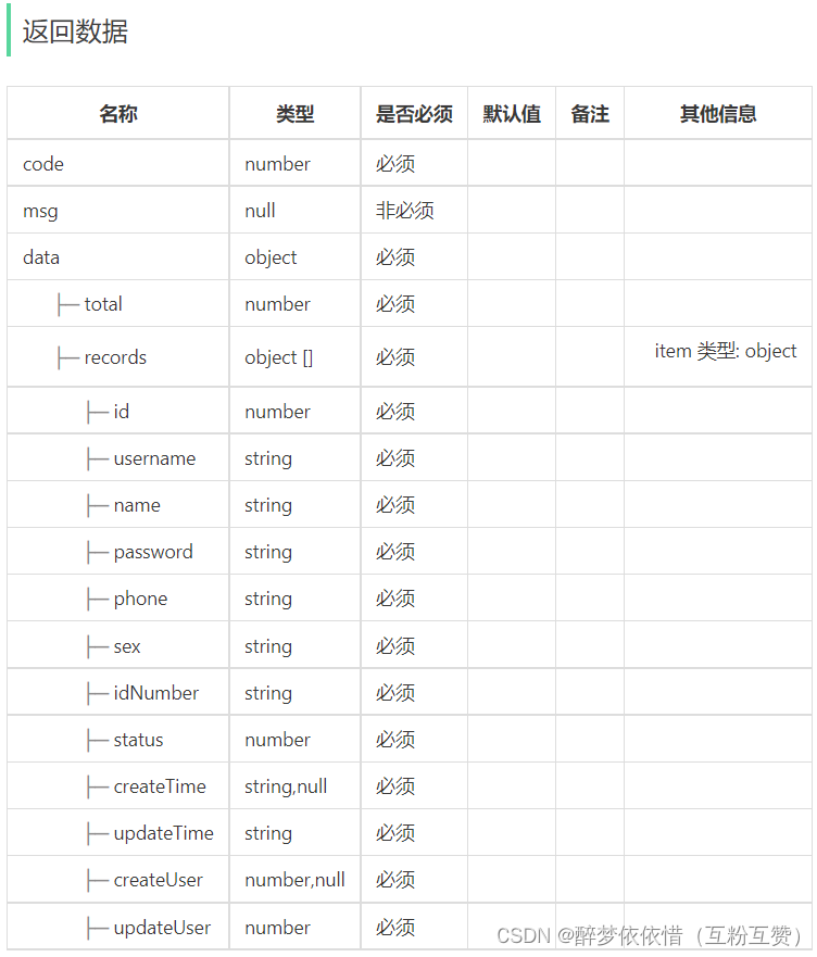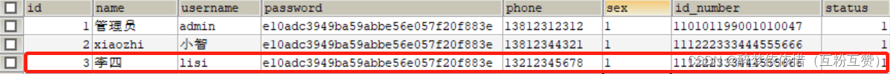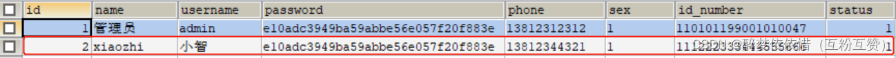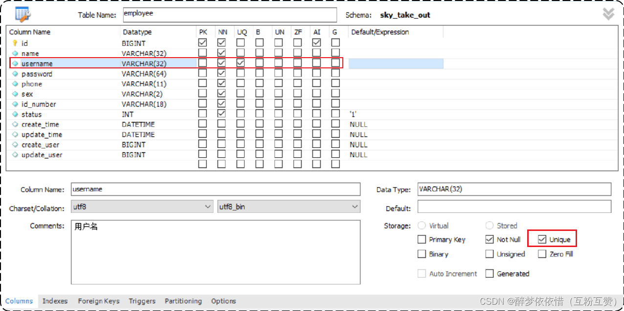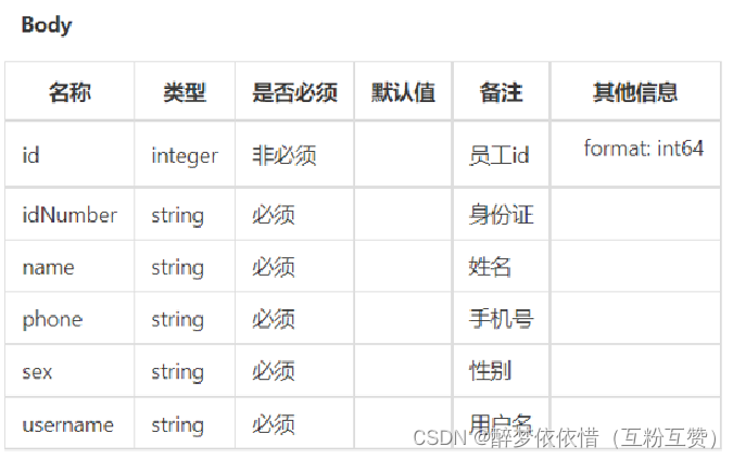字段名 数据类型 说明 备注 id bigint 主键 自增 name varchar(32) 姓名 username varchar(32) 用户名 唯一 password varchar(64) 密码 phone varchar(11) 手机号 sex varchar(2) 性别 id_number varchar(18) 身份证号 status Int 账号状态 1正常 0锁定 create_time Datetime 创建时间 update_time datetime 最后修改时间 create_user bigint 创建人id update_user bigint 最后修改人id 其中,employee表中的status字段已经设置了默认值1,表示状态正常。