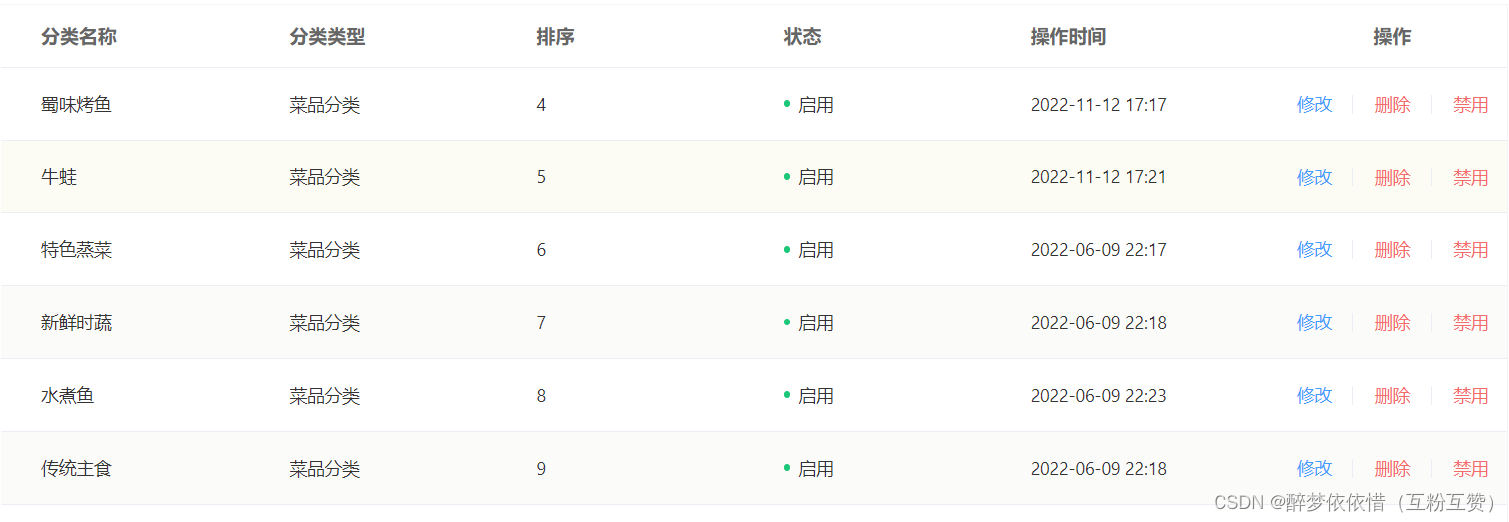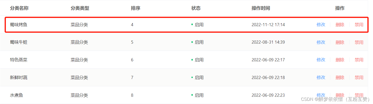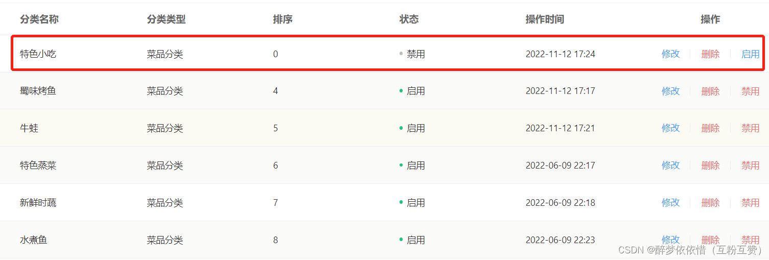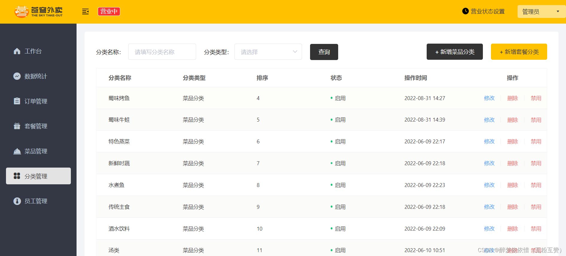 启用禁用菜品分类:在分类管理列表页面,可以对某个分类进行启用或者禁用操作。