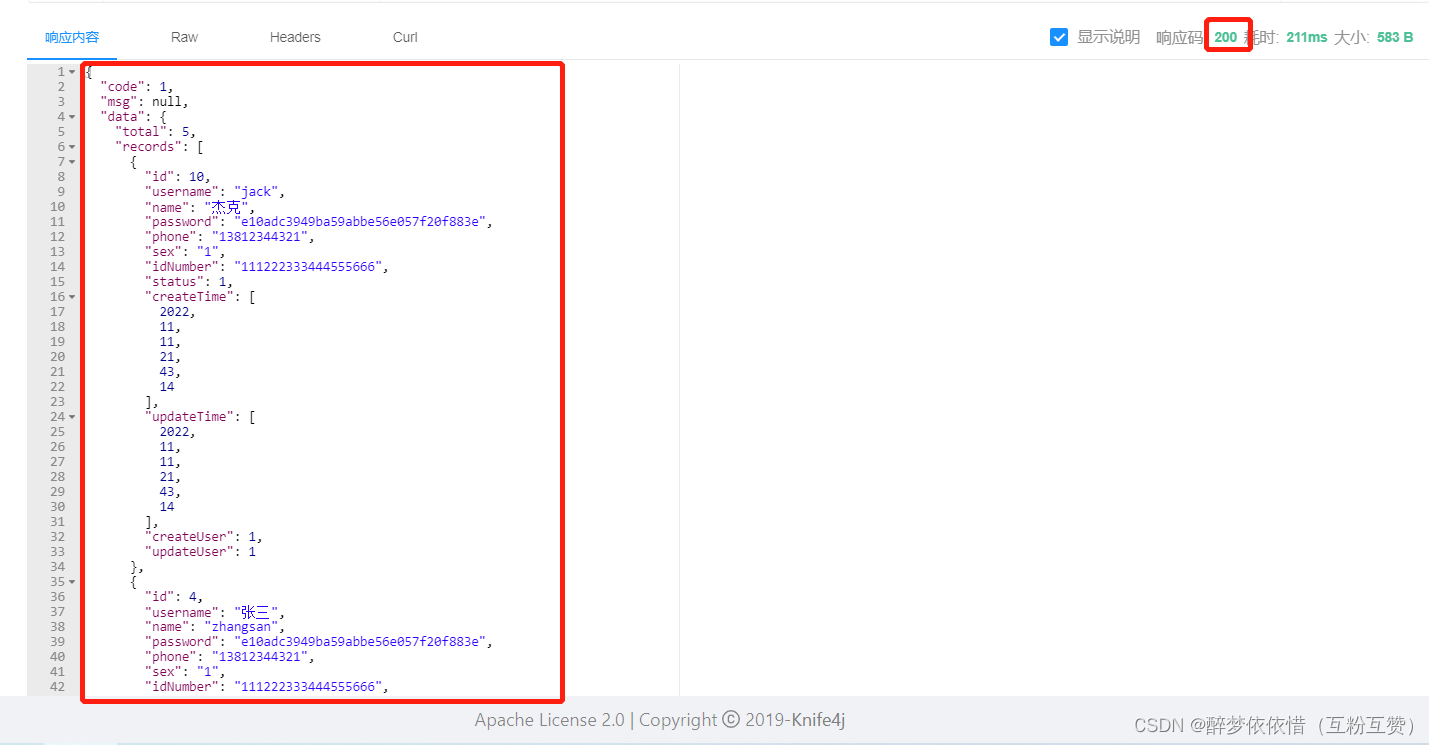 { "id": 0, "idNumber": "111222333444555666", "name": "xiaozhi", "phone": "13812344321", "sex": "1", "username": "小智" }响应码:401 报错