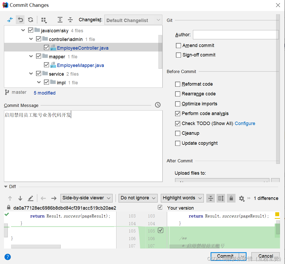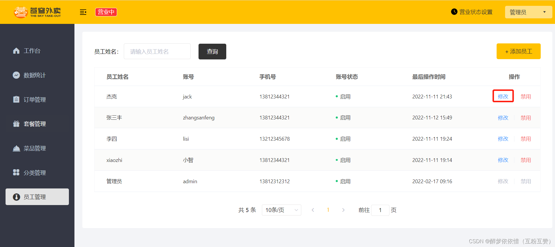 /** * 编辑员工信息 * * @param employeeDTO */ public void update(EmployeeDTO employeeDTO) { Employee employee = new Employee(); BeanUtils.copyProperties(employeeDTO, employee); employee.setUpdateTime(LocalDateTime.now()); employee.setUpdateUser(BaseContext.getCurrentId()); employeeMapper.update(employee); }在实现启用禁用员工账号功能时,已实现employeeMapper.update(employee),在此不需写Mapper层代码。