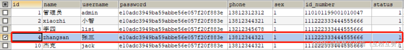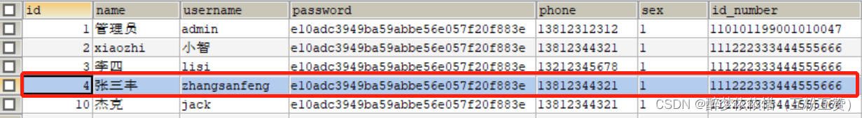 修改id=4的员工信息,name由zhangsan改为张三丰,username由张三改为zhangsanfeng。