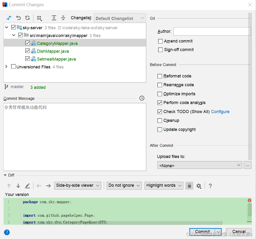 <?xml version="1.0" encoding="UTF-8" ?> <!DOCTYPE mapper PUBLIC "-//mybatis.org//DTD Mapper 3.0//EN" "http://mybatis.org/dtd/mybatis-3-mapper.dtd" > <mapper namespace="com.sky.mapper.CategoryMapper"> <select id="pageQuery" resultType="com.sky.entity.Category"> select * from category <where> <if test="name != null and name != ''"> and name like concat('%',#{name},'%') </if> <if test="type != null"> and type = #{type} </if> </where> order by sort asc , create_time desc </select> <update id="update" parameterType="Category"> update category <set> <if test="type != null"> type = #{type}, </if> <if test="name != null"> name = #{name}, </if> <if test="sort != null"> sort = #{sort}, </if> <if test="status != null"> status = #{status}, </if> <if test="updateTime != null"> update_time = #{updateTime}, </if> <if test="updateUser != null"> update_user = #{updateUser} </if> </set> where id = #{id} </update> <select id="list" resultType="Category"> select * from category where status = 1 <if test="type != null"> and type = #{type} </if> order by sort asc,create_time desc </select> </mapper>5.2.2 Service层