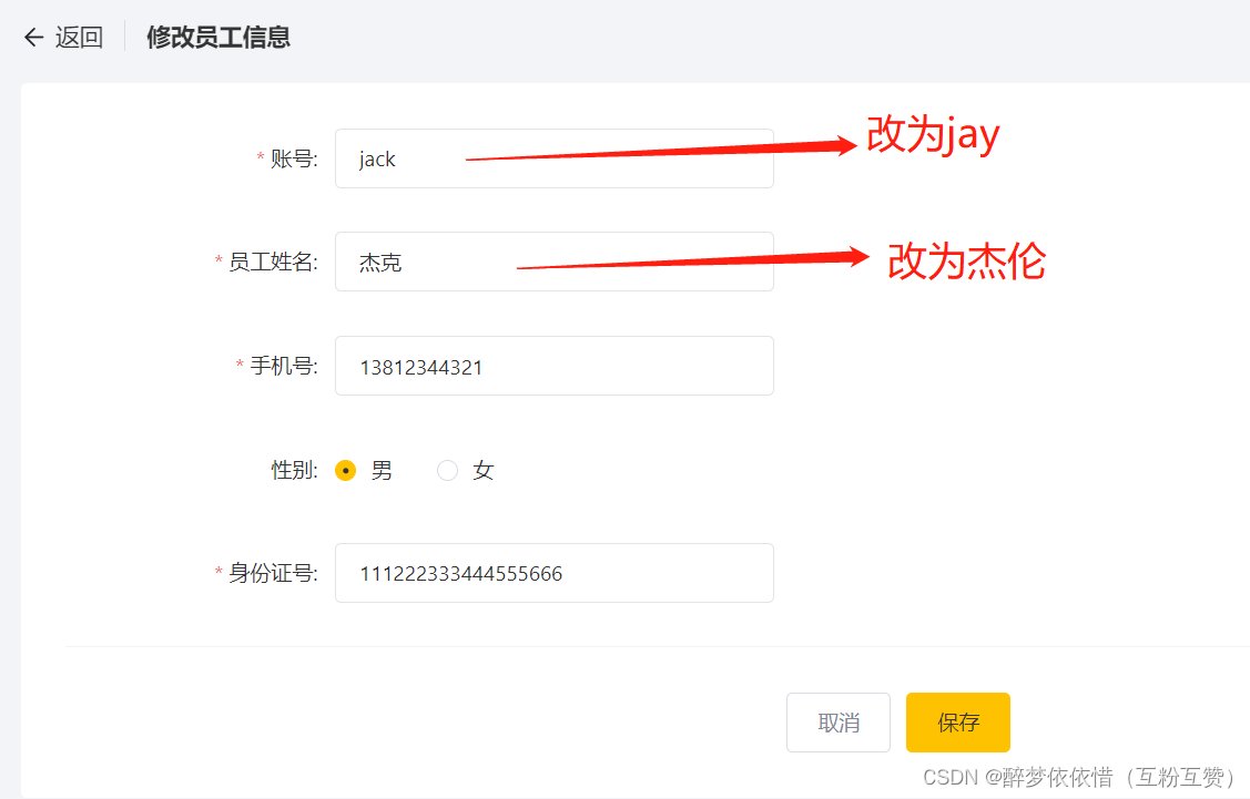 对员工姓名为杰克的员工数据修改,点击修改,数据已回显