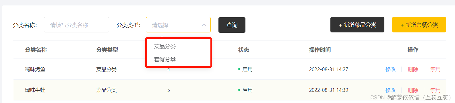 分类类型查询:当点击分类类型下拉框时,从数据库中查询所有的菜品分类数据进行展示。