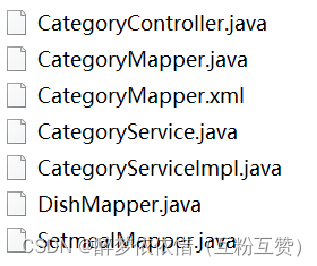 字段名 数据类型 说明 备注 id bigint 主键 自增 name varchar(32) 分类名称 唯一 type int 分类类型 1菜品分类 2套餐分类 sort int 排序字段 用于分类数据的排序 status int 状态 1启用 0禁用 create_time datetime 创建时间 update_time datetime 最后修改时间 create_user bigint 创建人id update_user bigint 最后修改人id 5.2 代码导入