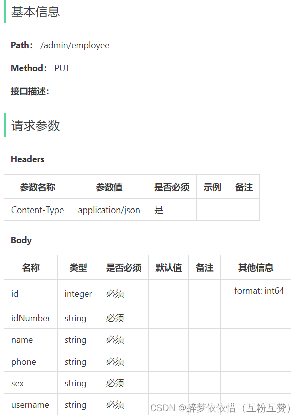 /** * 编辑员工信息 * @param employeeDTO * @return */ @PutMapping @ApiOperation("编辑员工信息") public Result update(@RequestBody EmployeeDTO employeeDTO){ log.info("编辑员工信息:{}", employeeDTO); employeeService.update(employeeDTO); return Result.success(); }2). Service层接口