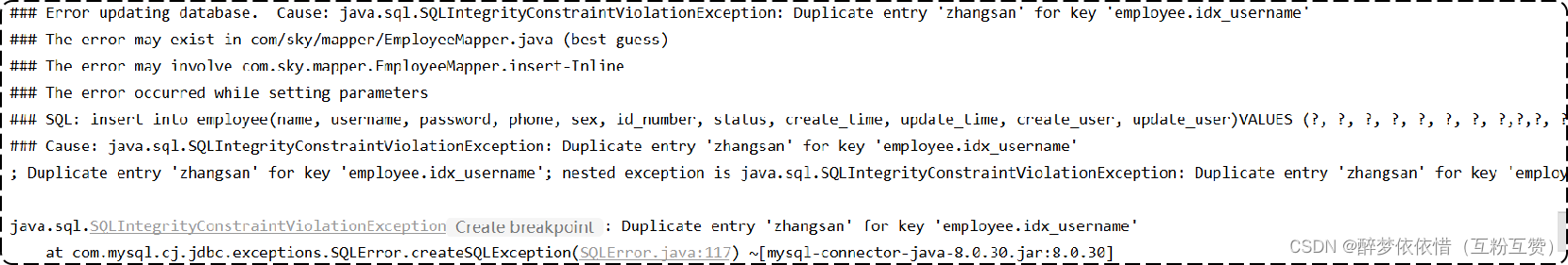 /** * 处理SQL异常 * @param ex * @return */ @ExceptionHandler public Result exceptionHandler(SQLIntegrityConstraintViolationException ex){ //Duplicate entry 'zhangsan' for key 'employee.idx_username' String message = ex.getMessage(); if(message.contains("Duplicate entry")){ String[] split = message.split(" "); String username = split[2]; String msg = username + MessageConstant.ALREADY_EXISTS; return Result.error(msg); }else{ return Result.error(MessageConstant.UNKNOWN_ERROR); } }进入到sky-common模块,在MessageConstant.java添加