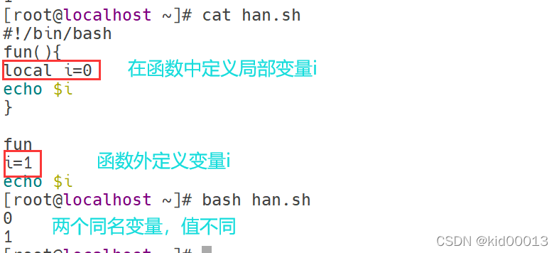 一般来说,在shell脚本中定义的变量,他的作用范围仅限于shell脚本内,退出当前的bash环境,该变量就会失效。同样的,为了区分函数和主体部分的变量,我们可以将变量的作用范围限制在函数中即: