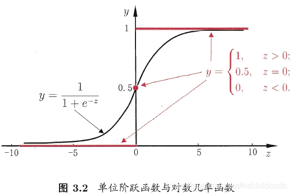 首先考虑二分类的任务,其输出标记是,而线性回归模型产生的预测值是实值。那么如何将实值转为0/1值呢? 数学中的函数各种各样,对于当前的任务来说,“单位阶跃函数”最为理想:
