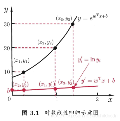 “广义线性模型”:这种模型也就是说当我们拿到数据的时候,发现x和y并非呈现只管的线性分布,那我们就将当前的函数进行转变,使其接近线性函数,以对数线性回归为例: