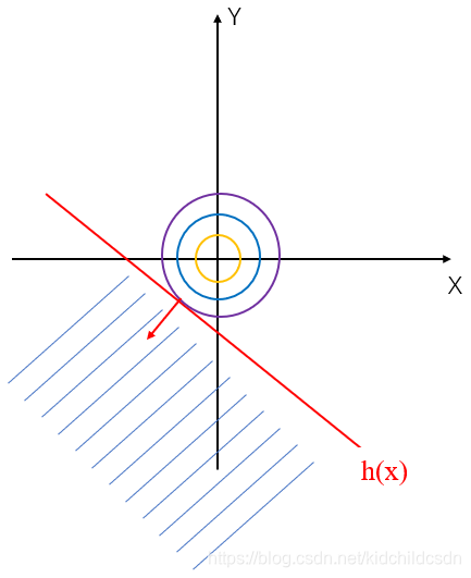 如图所示,要想求出原点到h(x)的最短距离,我们只需要以原点为圆心,画圆直到与h(x)相切,那个切点就是我们求的点,博主的个人理解就是的梯度是红色箭头,指向可行域,而f(x)的梯度指向原点,因为我们希望求的是f(x)的最小值,以原点为中心作的切线圆越接近原点越好,当然不希望是个扩大的形式,所以从这样看,f(x)的梯度和g(x)的梯度相反,可能我理解的不够准确,如果大家有更好的理解方法,可以一起交流。