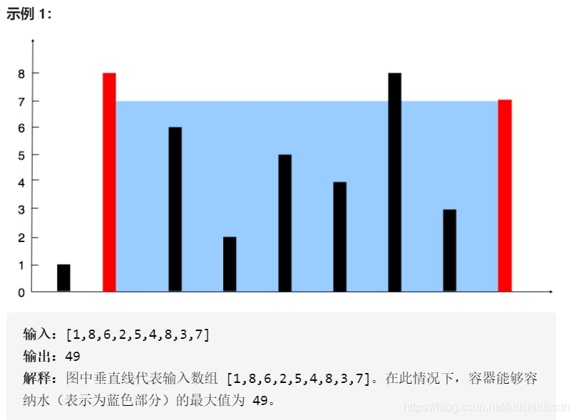 给你 n 个非负整数 a1,a2,...,an,每个数代表坐标中的一个点 (i, ai) 。在坐标内画 n 条垂直线,垂直线 i 的两个端点分别为 (i, ai) 和 (i, 0) 。找出其中的两条线,使得它们与 x 轴共同构成的容器可以容纳最多的水。