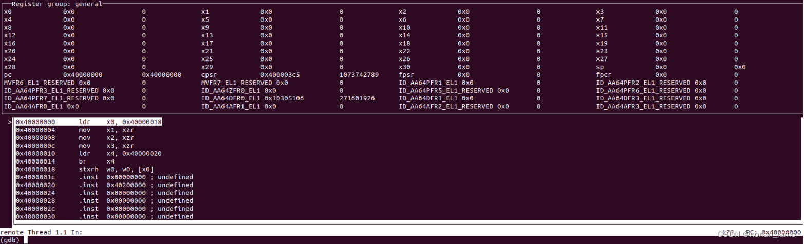 从前面的截图可以看到,此时寄存器PC指向的是0x40000000 这个地址,可以理解为kernel启动的地址为0x40000000