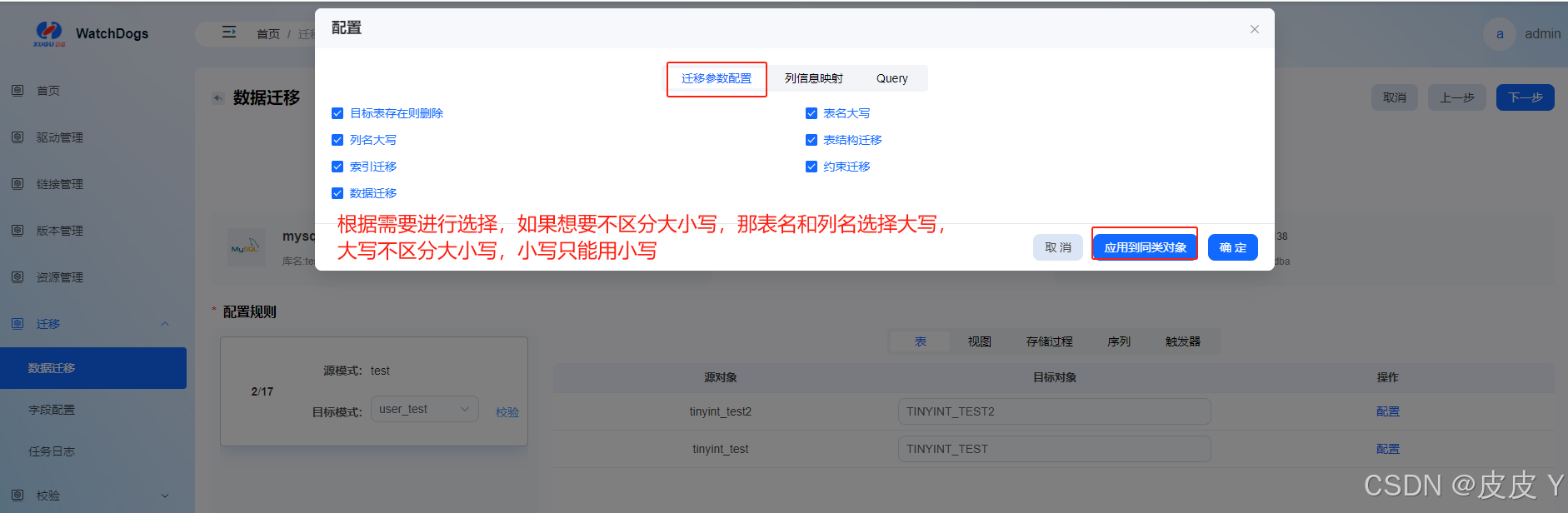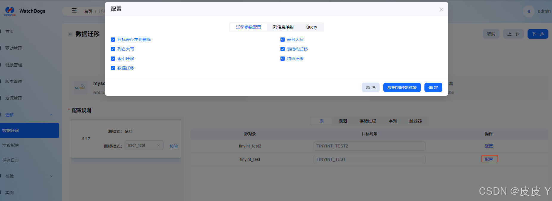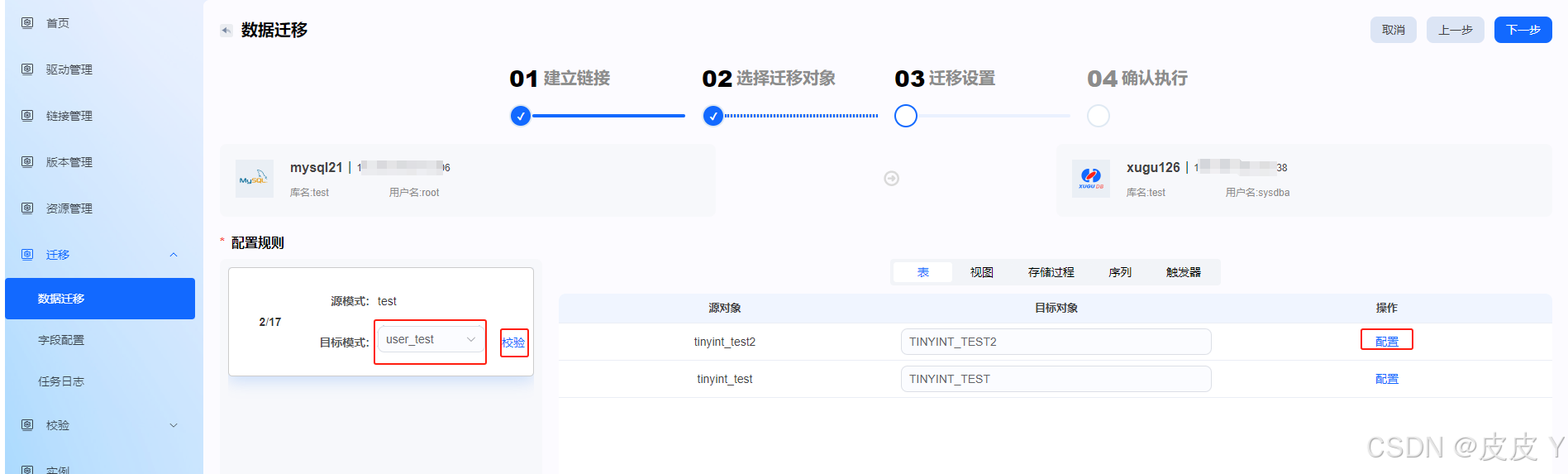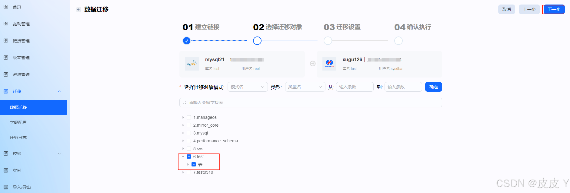3.选择迁移的目标模式,配置迁移的对象,如果有大表可以先迁移表结构,再多建几个任务迁移数据
