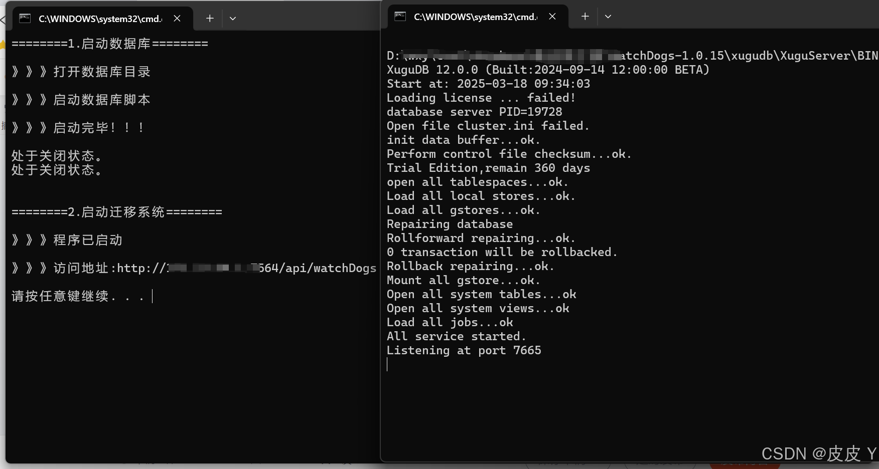 这里以windows展示启动过程,双击start.bat后会弹出两个cmd窗口,一个窗口显示启动的过程和工具的网页访问地址,一个窗口显示工具数据库启动日志