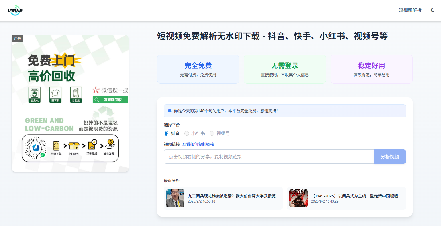 图1:我开发的短视频无水印下载网站首页(纯网页端工具)