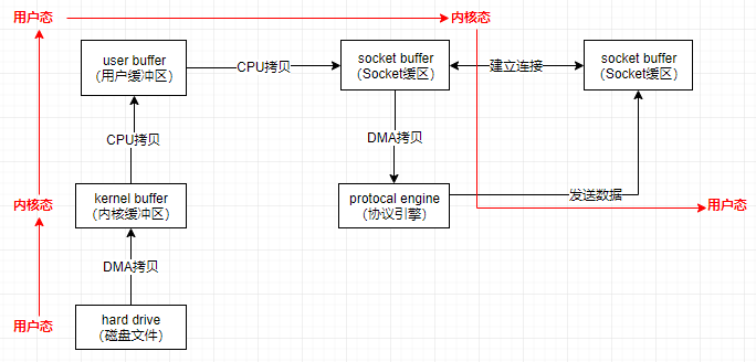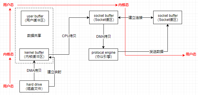 先上一张图,这张图就代表了传统 IO 传输文件的流程。读取文件的时候,会从用户态切换为内核态,同时基于 DMA 引擎将磁盘文件拷贝到内核缓冲区。