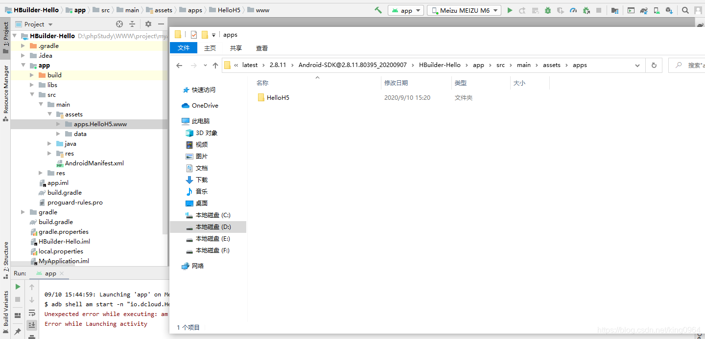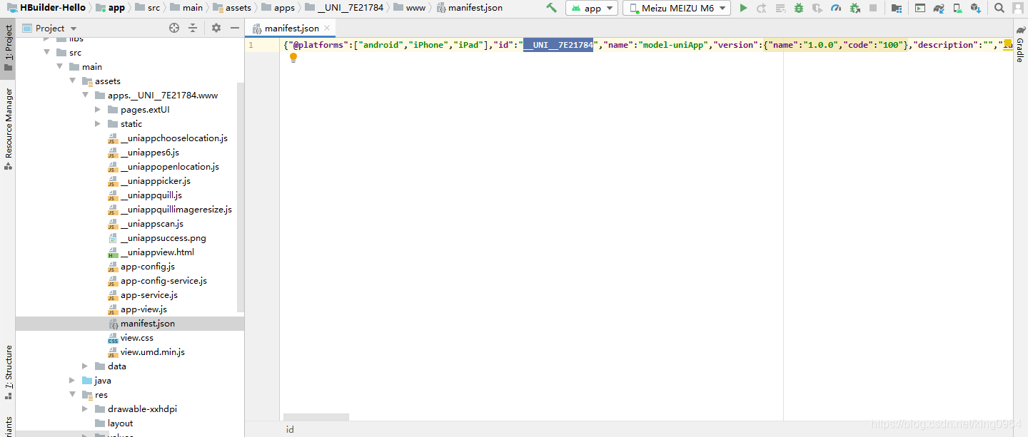 5. 打开 android studio 切换项目到project目录,依次打开 HBuilder-Hello > app > src > main > assets,能看到 apps.HelloH5.www 和 data 两个文件夹;