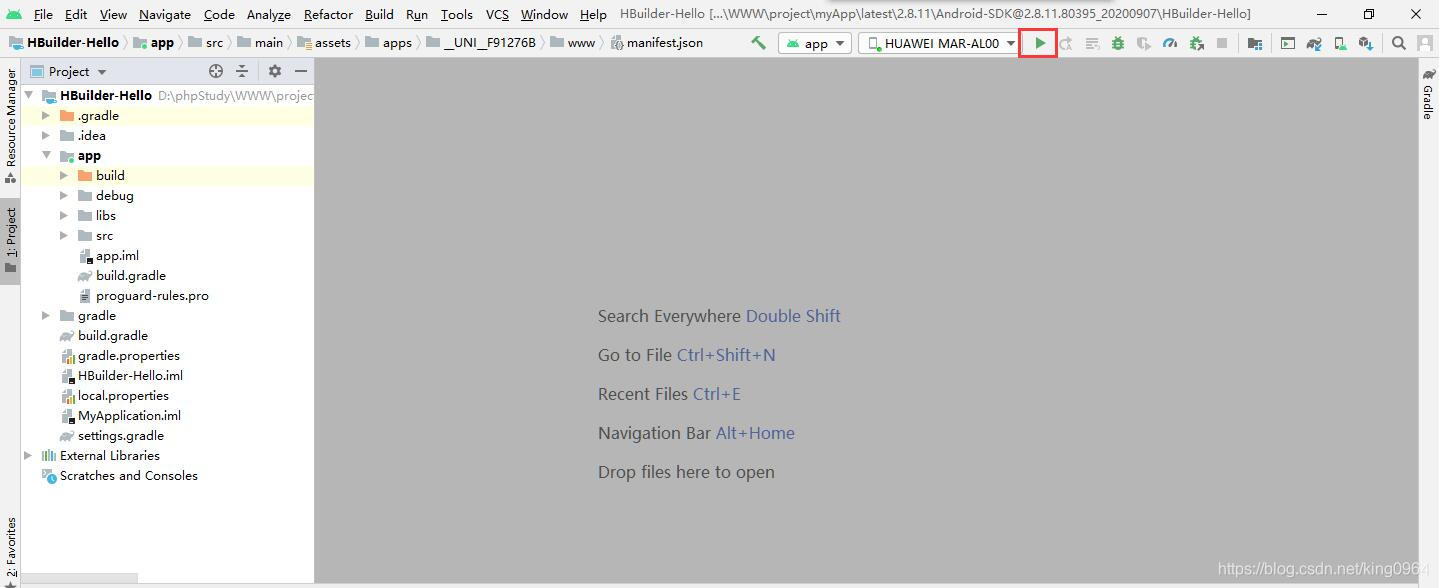 2. 运行android studio,选择导入项目HBuilder-Hello;