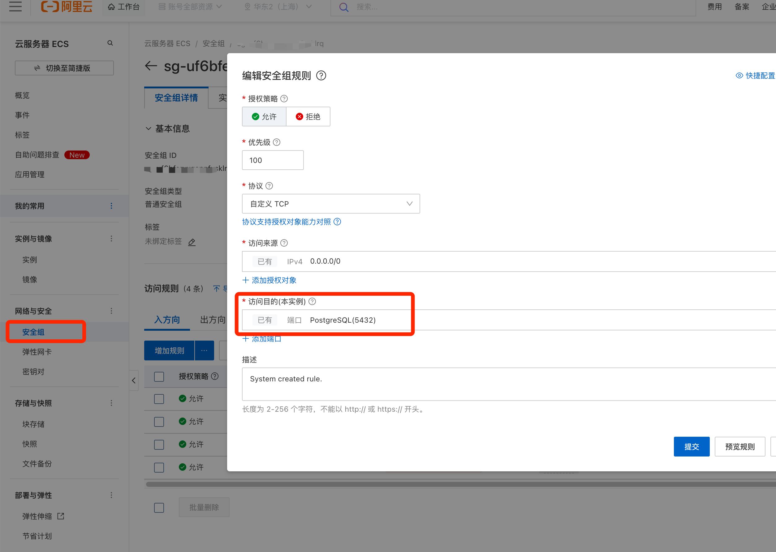 在阿里云ECS实例列表中,选中服务器实例,在安全组策略中放行 5432 端口