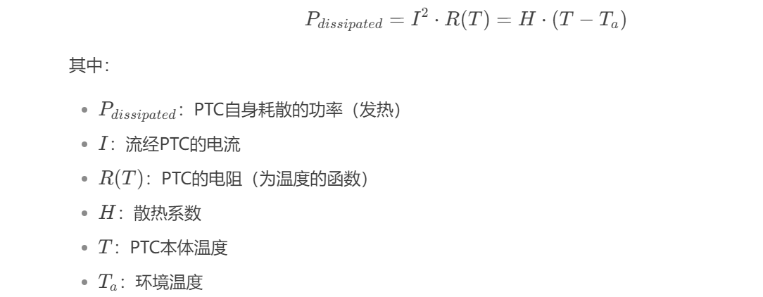 PTC的工作本质是一个电-热-电阻的动态平衡过程,其数学模型可简化为: