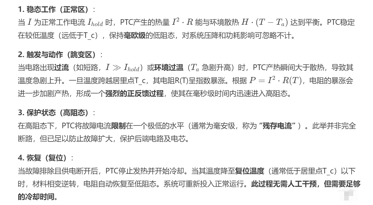 与主动保护(Active Protection)协同:BMS主控通过AFE监测电压、电流,并通过NTC测温。当检测到异常时,会主动关断充放电MOSFET。PTC作为一道独立的、被动的、模拟式的后备保护,即使MCU死机、软件跑飞、采样电路失效,PTC依然能基于物理定律提供最终保护。