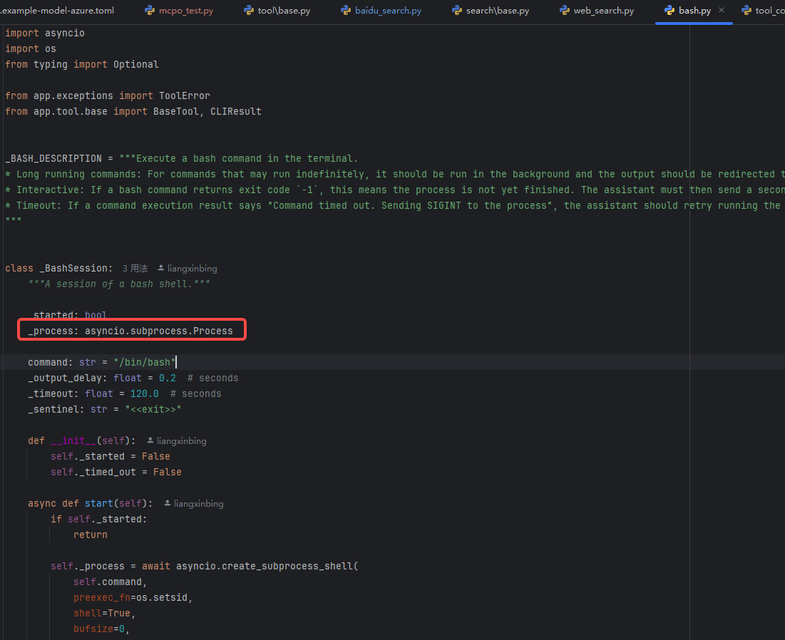 核心逻辑是一个基于asyncio.subprocess.Process 实现的/bin/bash命令的工具类: