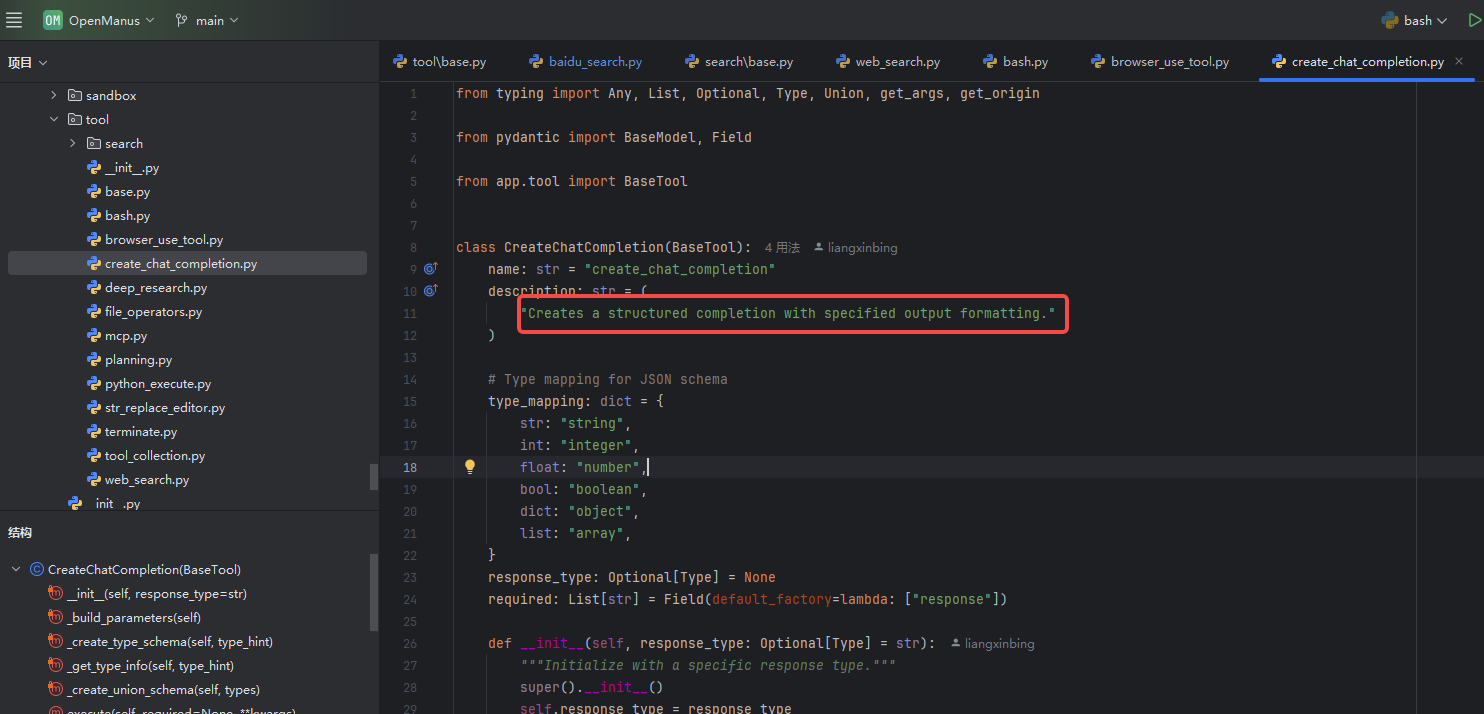 BaseTool(假设为自定义工具基类),通过name和description定义工具标识 type_mapping实现 Python 类型到 JSON Schema 类型的映射(如str → "string"),用于参数生成