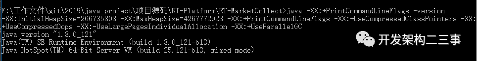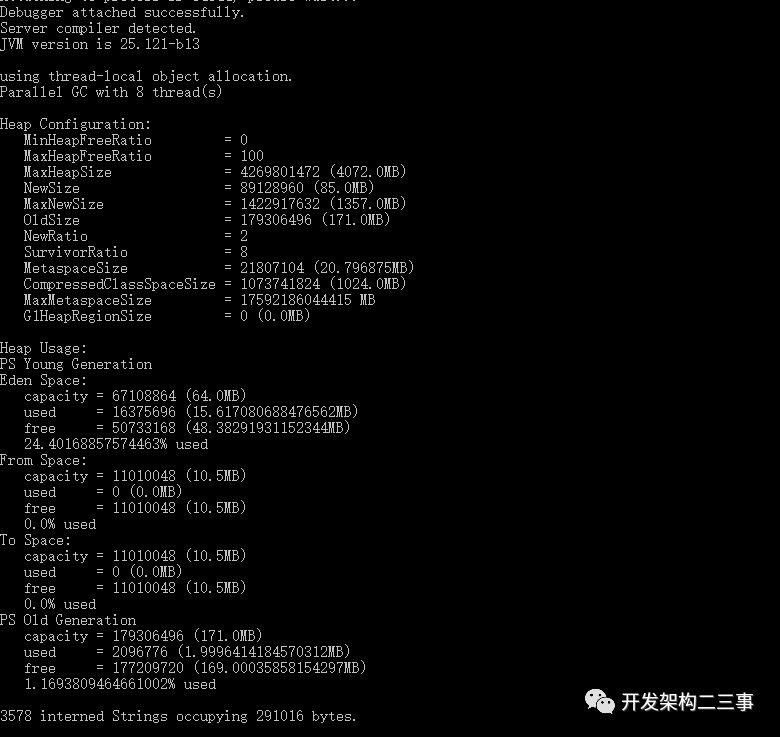 可以看到堆的分代情况以及各区域的使用情况,垃圾收集器使用的是Parallel GC与java -XX:+PrintCommandLineFlags -version得到的结果一致:
