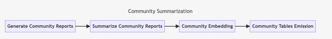 - 最终输出:社区报告表包含了社区的所有关键信息和嵌入,供后续阶段使用。