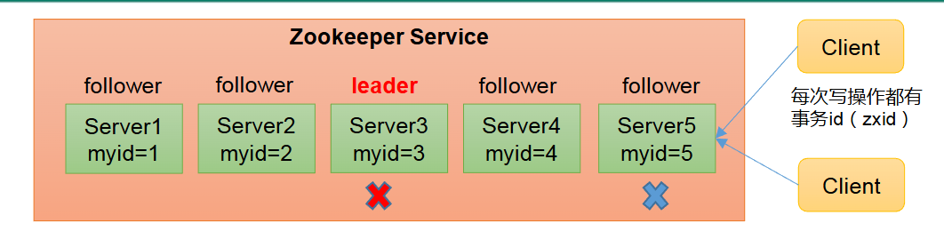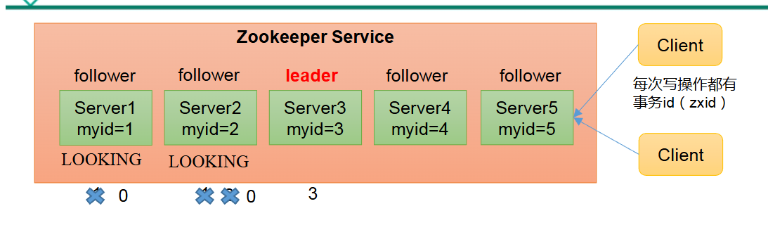 假设ZooKeeper由5台服务器组成,SID分别为1、2、3、4、5,ZXID分别为8、8、8、7、7,并且此时SID为3的服务器是Leader。某一时刻,3和5服务器出现故障,因此开始进行Leader选举。