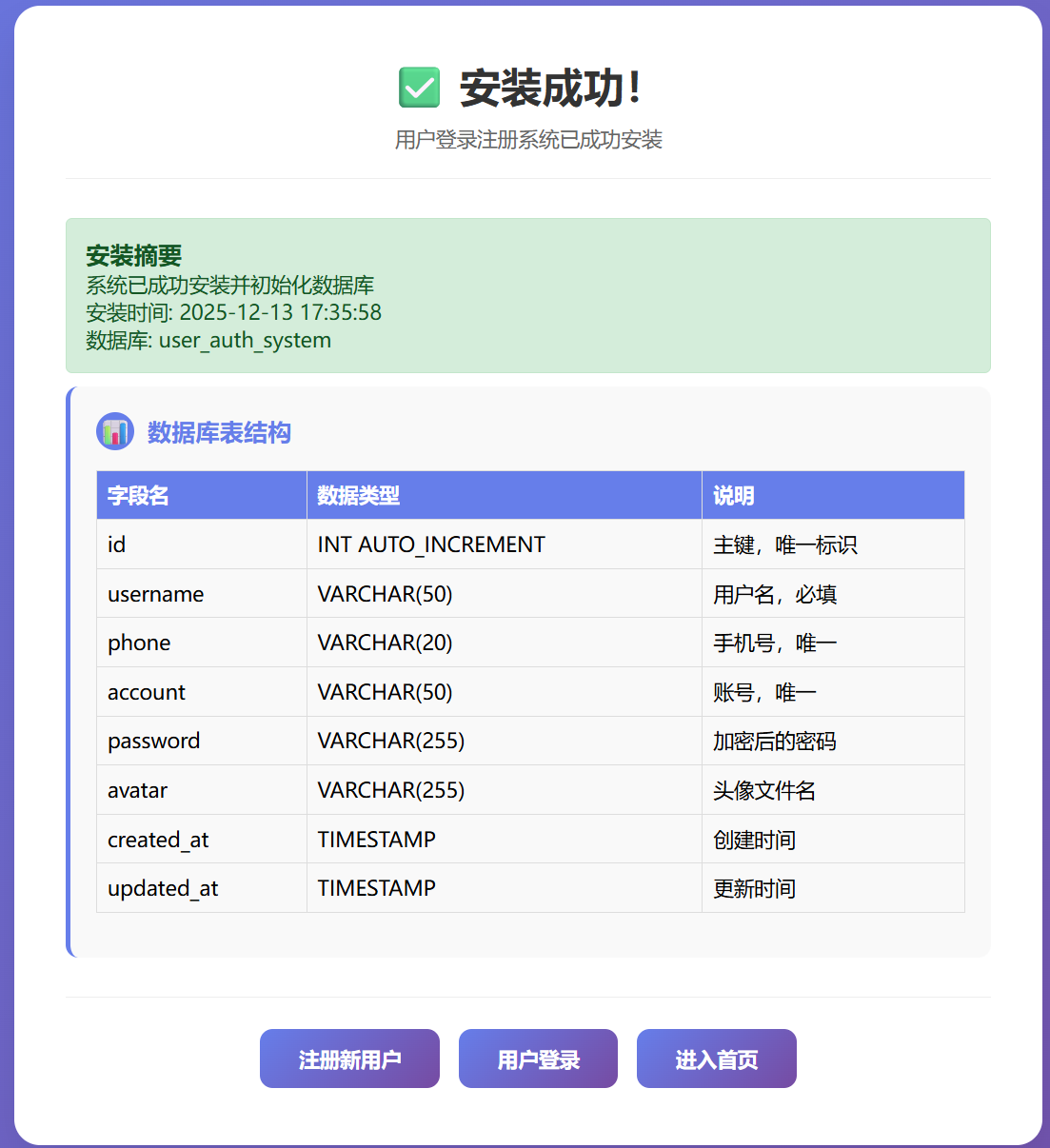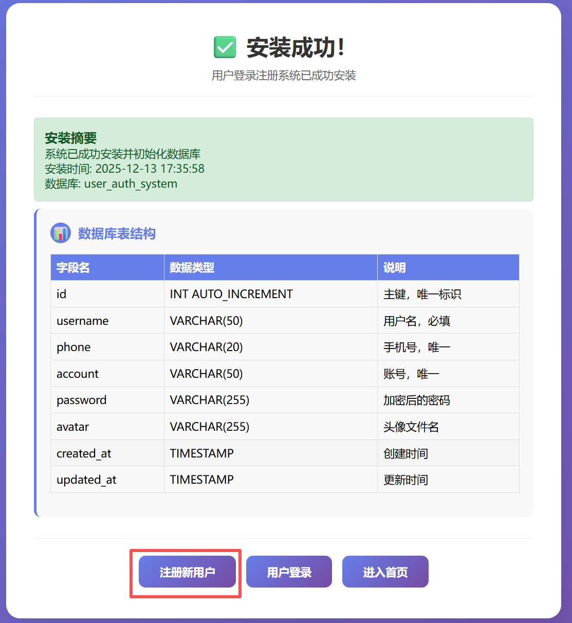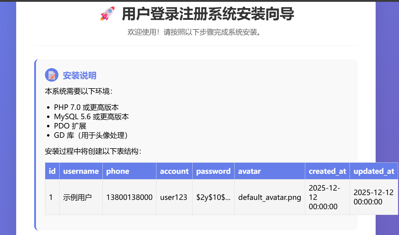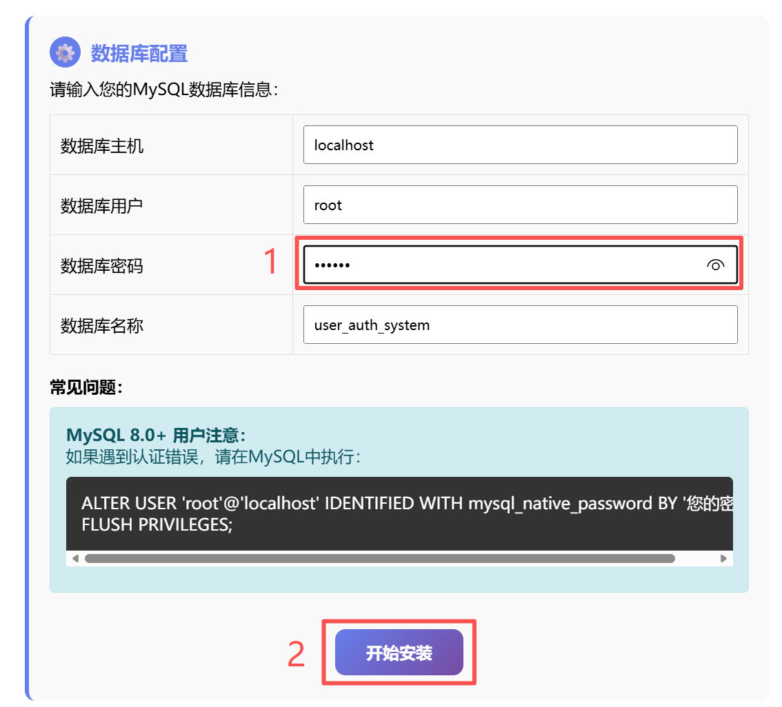 打开浏览器,输入http://localhost/user_auth_system/install.php会进入以下界面