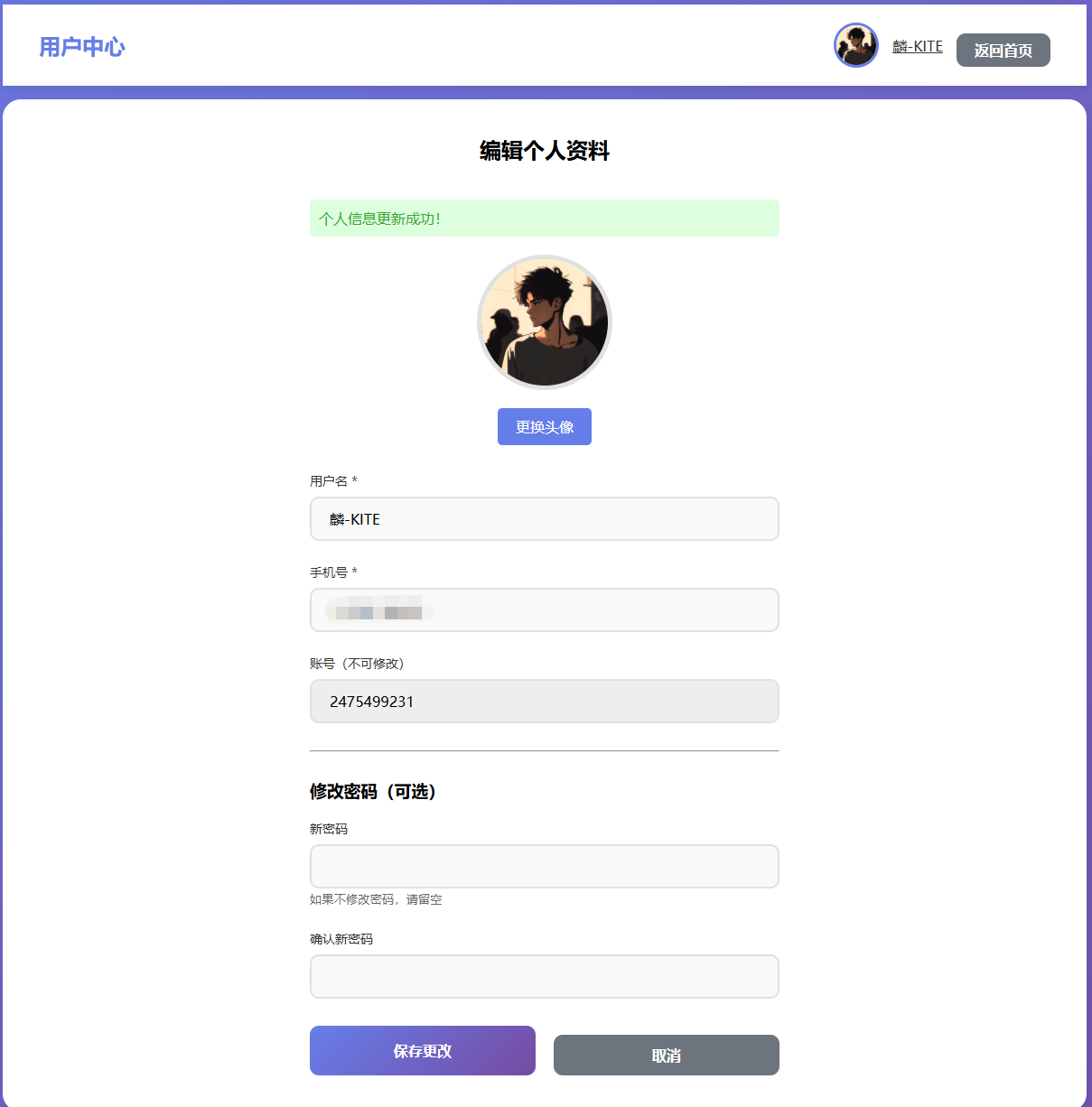 即可进入首页的用户中心,在该页面可以换头像,改昵称和密码