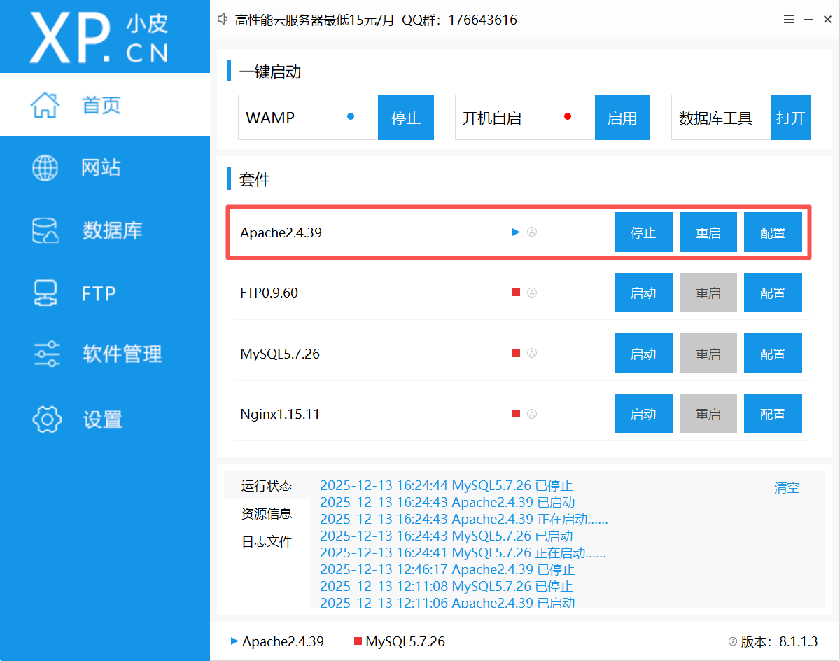 第二步,开启你的 phpstudy 并启动Apache2.4.39