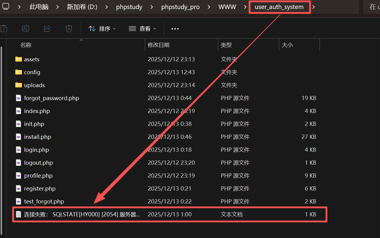 在WWW文件夹下进入user_auth_system 打开如图的文件,按照里面的内容操作,当然你们没有,因为我还没给你们文件压缩包呢