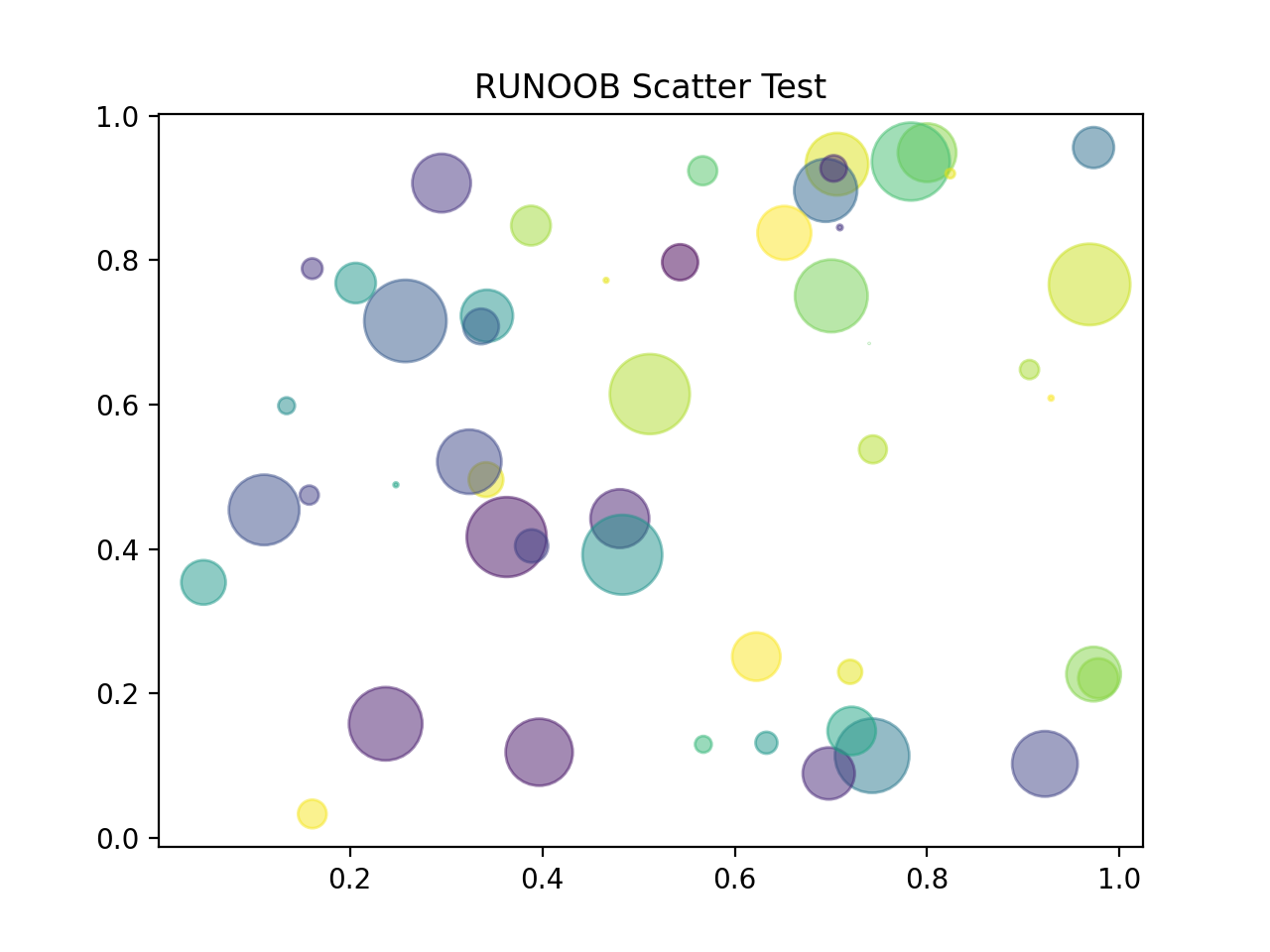 plt.scatter(x, y, s=area, c=colors, alpha=0.5) # 设置颜色及透明度