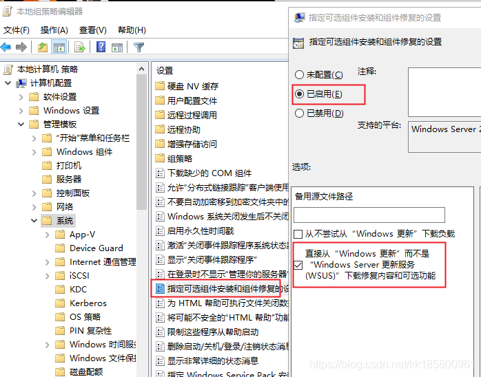 "已启用" ——> 直接从"Windows Update" 而不是 "Windows Server Update Services (WSUS)" 下载修复内容和可选功能