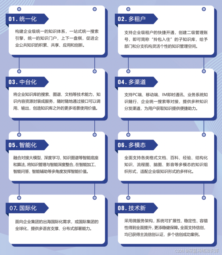 此次项目采用深蓝海域KMPRO统一智能知识管理平台7.0版本,是一款面向企业级知识管理需求的新一代产品。在继续秉持全生命周期知识管理的产品理念和能力基础上,该系统采用多租户模式,支持集团多层级法人或分支机构独立使用,兼顾集团统一管管理和租户个性化应用。国际化模式支持多语言、全球分布式部署,助力企业集团出海战略。知识中台以微服务和丰富的API对外提供知识能力和内容输出服务。多终端接入,支持WEB、移动端、IM、业务系统对接等多种场景模式访问和调用知识库。