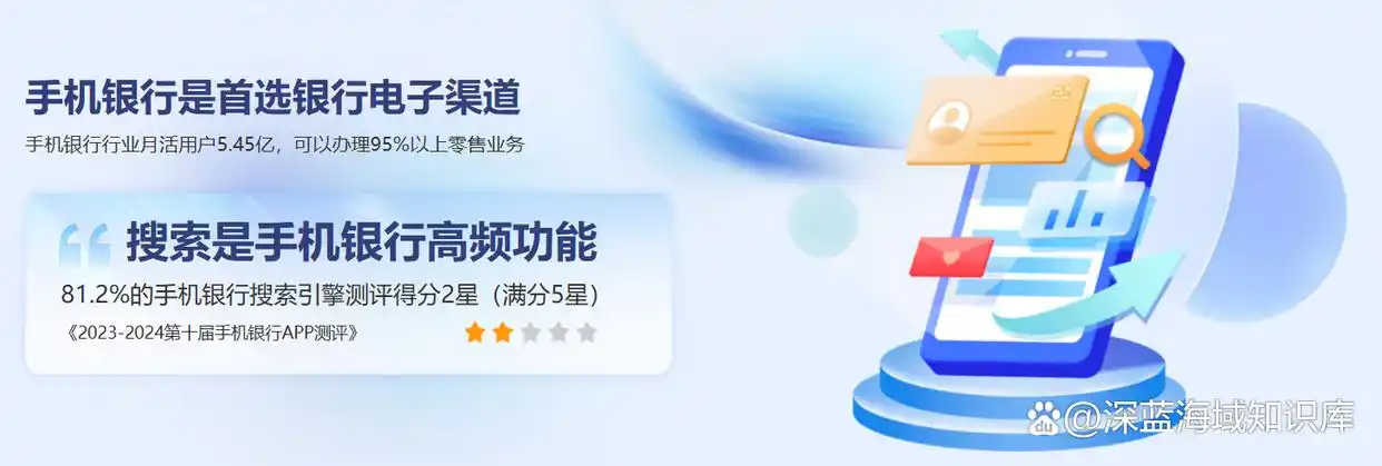 搜索是客户使用频率较高的功能,搜索体验很大程度上影响用户使用。但是根据2023-2024第十届手机银行APP测评数据显示,81.2%的手机银行搜索功能测评为2星及以下(5星为满分)。