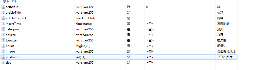 String sql = "select articleId,articleTitle,articleContent,insertTime,category,source,topage,count,image,hasImage,des "