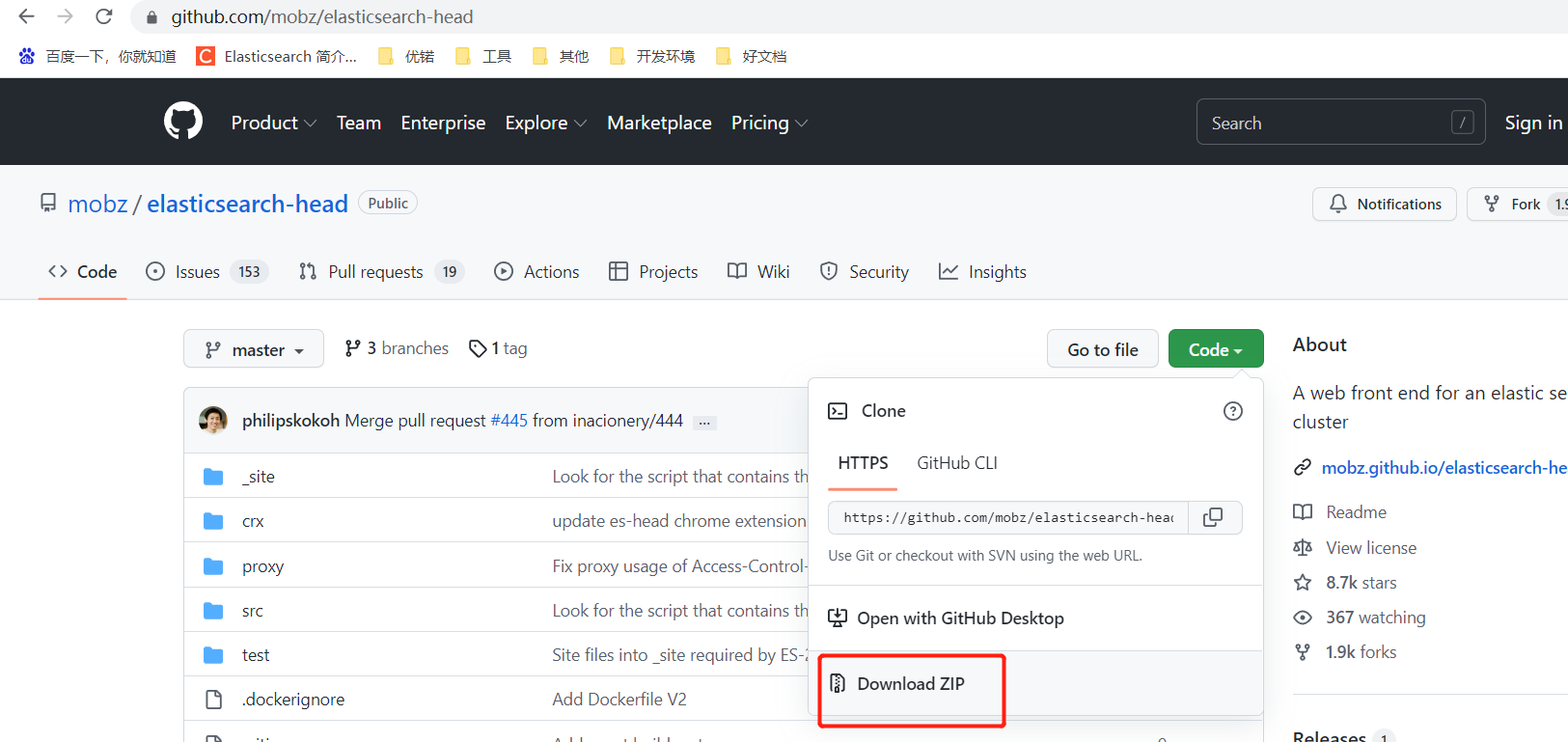 由于ES官方没有味ES提供界面管理工具,仅提供了后台服务,elasticsearch-head就是一个用于ES开发的页面客户端工具。其代码托管于GitHub:https://github.com/mobz/elasticsearch-head