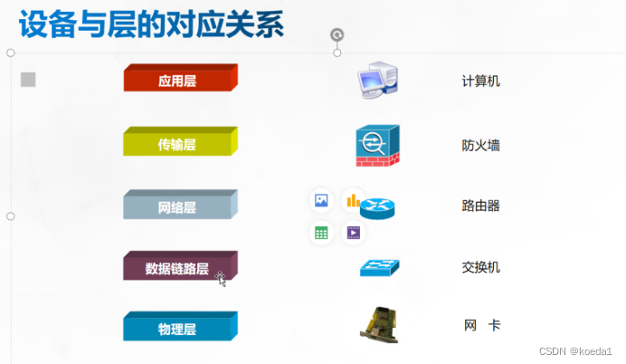 数据链路层:网卡设备。把数据变成数据帧(如交换机)