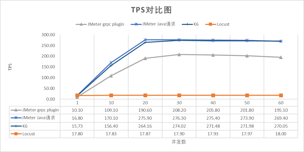 测试过程中依次增加10并发至60并发,每次运行5分钟,收集结果如下:
