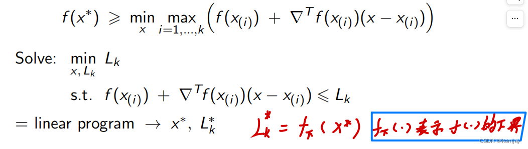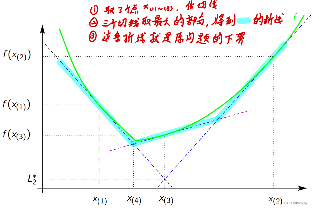 算法思想:随机取目标函数上的点,做这些点的切线,将这些切线连接,形成目标函数的下界,对约束函数也进行同样的操作,将折线中的最小值点作为新的点再做切线,迭代至折线最小值点对应的目标函数和折线值小于阈值。做切线如图所示: