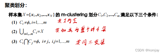 在聚类任务中,必须保证以下三个条件:(1)每个类别一定都有样本点、(2)所有样本点必属于某一类、(3)某个样本点只能属于一类。写成数学符号就是:
