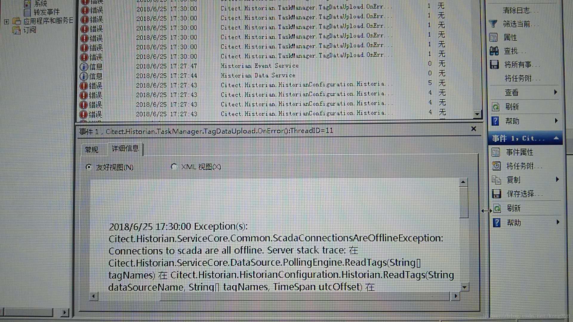 citect historian4.3连接两个SCADA数据源,一主一备。某天上层应用监控数据全部断线,重启historian后恢复,可不到半小时数据又断,反复出现。查找原因后发现在系统的事件查看器中,从下午2点开始出现报错信息。如图,到SCADA连接离线,测试historian到数据源的连接情况,备连接失败,把备连接去掉重启后,报错依然存在。最后发现备连接服务器蓝屏了,重启后historian恢复正常。怀疑是historian4.3bug.